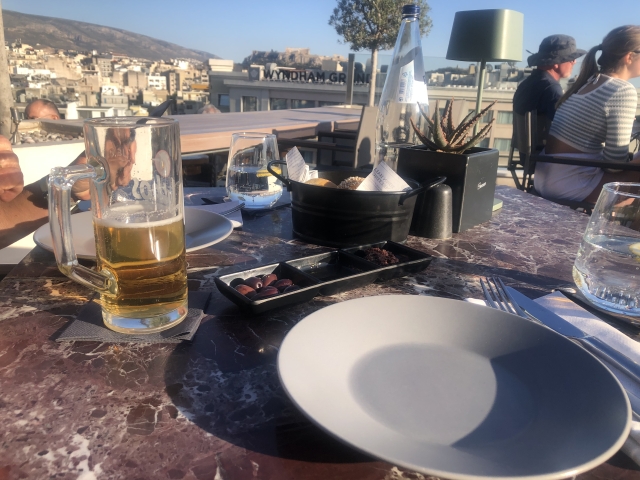 Als Standort in Athen haben wir das Hotel Stanley am Karasikaki-Platz ausgewählt. Es ist in Athen einfach zu finden und anzufahren (von Korinth kommend immer geradeaus bis zum Karasikaki-Platz fahren). Das Hotel verfügt über eine bewachte Tiefgarage für Pkw und Motorräder, sodass wir unser Motorrad für die Tage in der Stadt sicher abstellen konnten. Im 9. OG hat das Hotel einen herrlichen Pool zum Entspannen und Ausruhen sowie ein sehr gutes Restaurant – beides mit fantastischem Blick auf den Parthenon und die Akropolis. Das Hotelfrühstück findet übrigens auch im 9. OG im Restaurant statt, sodass man schon morgens den wundervollen Blick auf das Weltwunder Akropolis hat.
