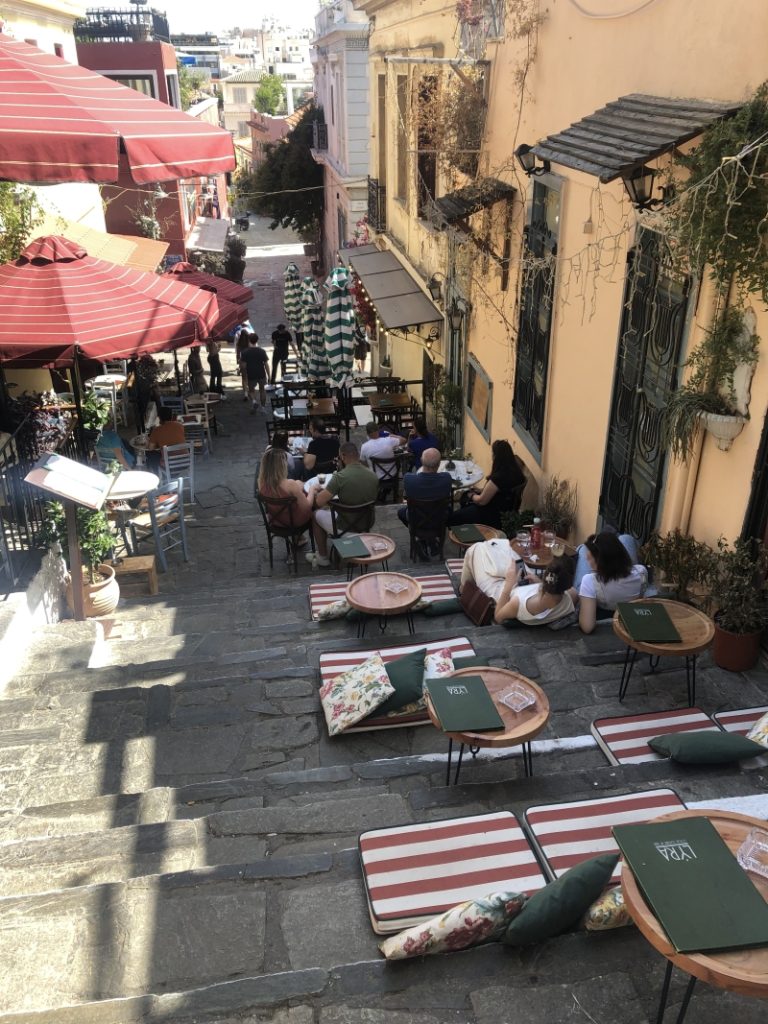 Besonders gut hat uns das Viertel Anafiotika gefallen, das sich eng an den Felsen der Akropolis anschmiegt und viele gemütliche Ecken und Gässchen hat. Es gibt aber auch viele Treppenstufen, die oft mit Cafés und kleinen Restaurants belegt sind, sodass man mitten im Geschehen ausruhen und genießen kann.